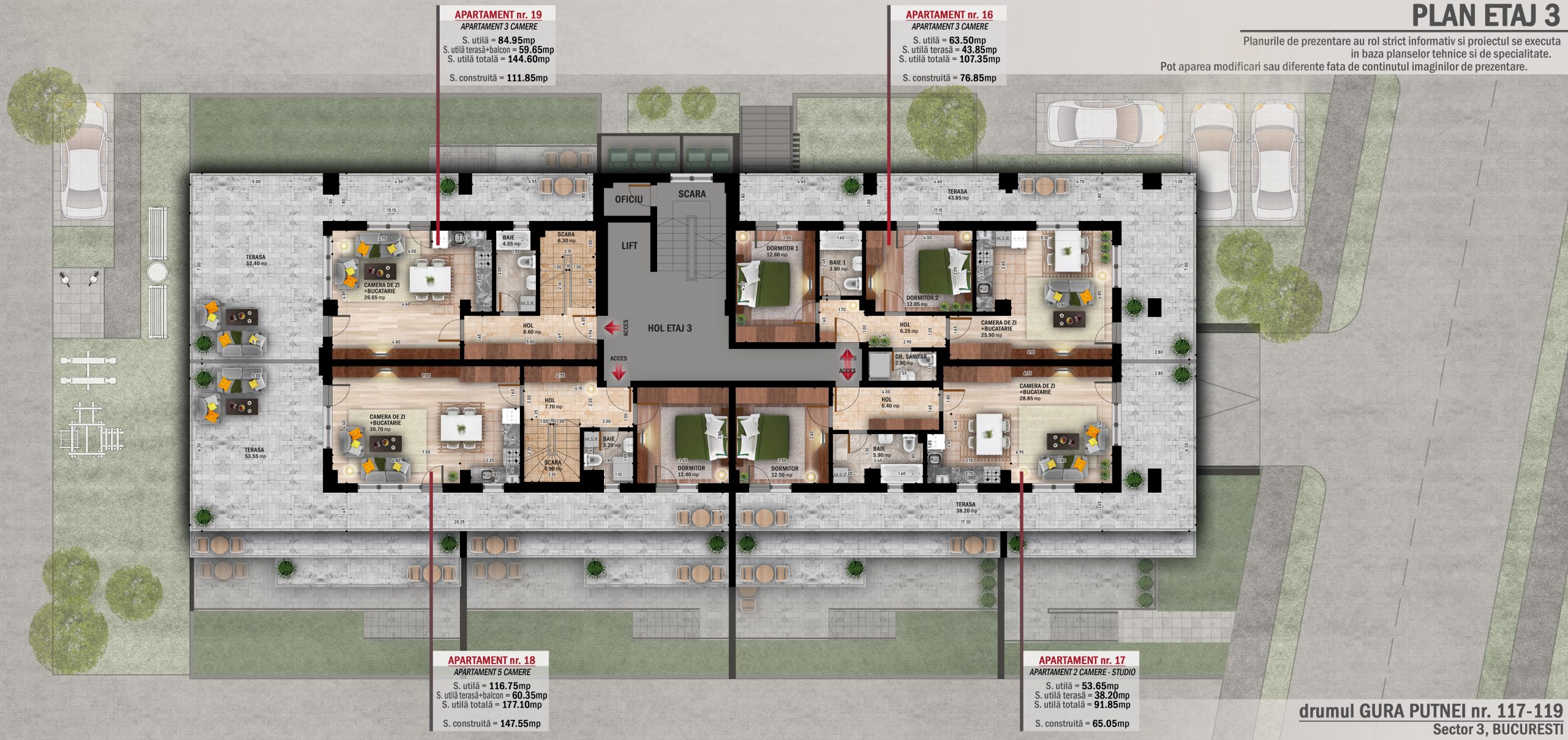 Apartament 3 Camere, Duplex, etaj 3 + 4, bucătărie, 2 băi, hol, terasă + balcon, scară, suprafață construită: 111.85mp