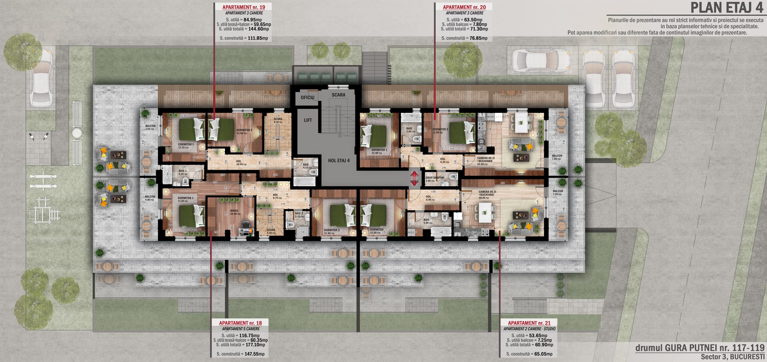 Descoperă eleganța și confortul apartamentului duplex cu 3 camere, distribuit pe etajele 3 și 4, cu o suprafață construită de 111.85 mp și o terasă generoasă și balcon pentru momente relaxante.